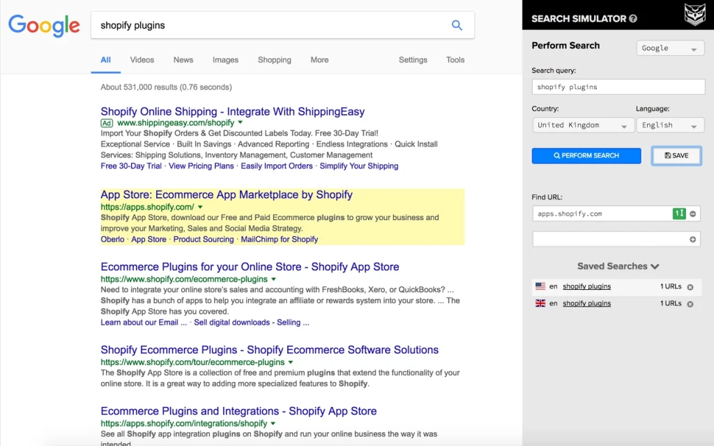 • URL Highlighting: You can input your domain or a competitor’s, and the tool will automatically highlight it in the search results and show you exactly what position it holds.