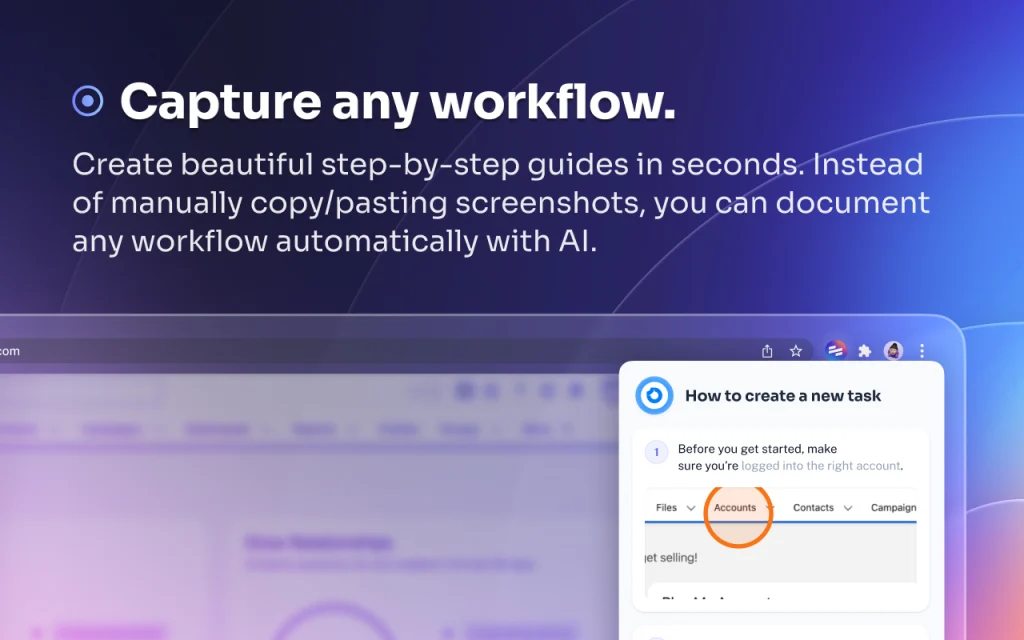 - Automatic Workflow Capture: Records your clicks, keystrokes, and screen navigation to automatically generate a guide with text instructions and corresponding screenshots for every step.