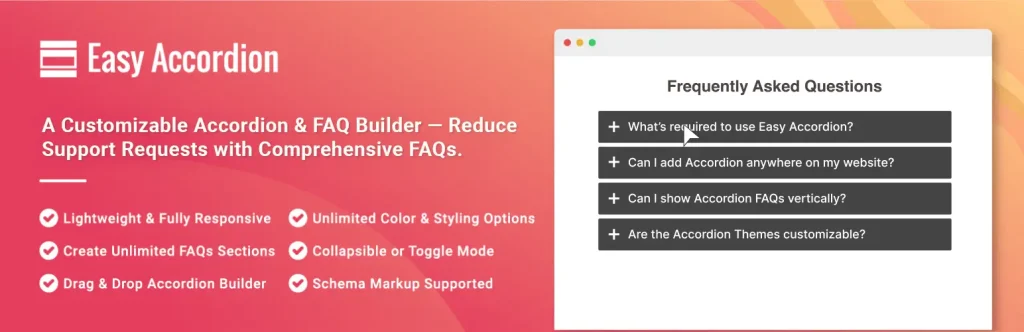 Easy Accordion is a FAQ builder plugin for WordPress. It provides a drag-and-drop interface to create unlimited accordions, FAQ sections, or pages, as well as WooCommerce Product FAQs.
